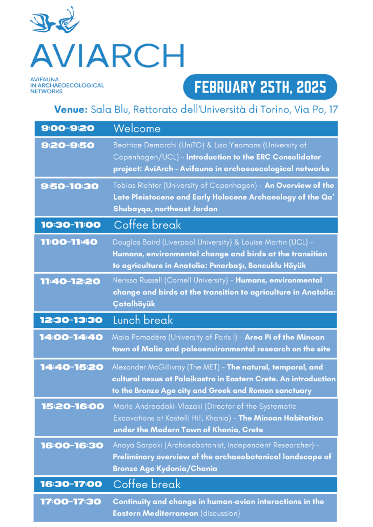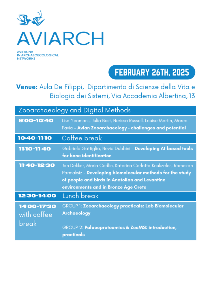 We successfully concluded the AviArch kick-off event held at UniTO at the end of February 2025. This meeting brought together leading scholars from various disciplines and countries, all committed to advancing the study of avifauna in archaeological contexts as well as their complex relationship with humans through time. Our four days were filled with productive presentations, discussions, and hands-on engagement with bird bones and eggs in the Department of Life Science and System Biology laboratories.